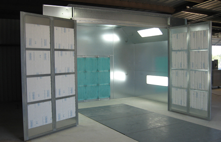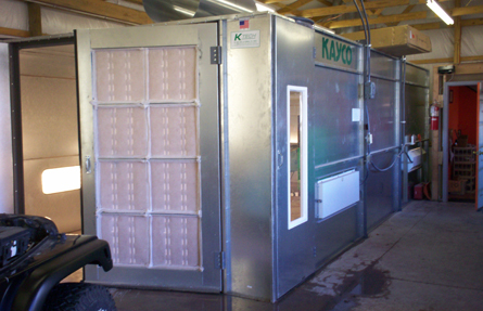 The Kayco cross-draft spray booth disperses fresh air across the automobile and eliminates airborne paint, particles and hazardous fumes through the filters in the rear of the booth. Also available in a reverse-flow design, the Kayco Cross-Draft Spray Booth can be modified to include 10 or 12 light options.